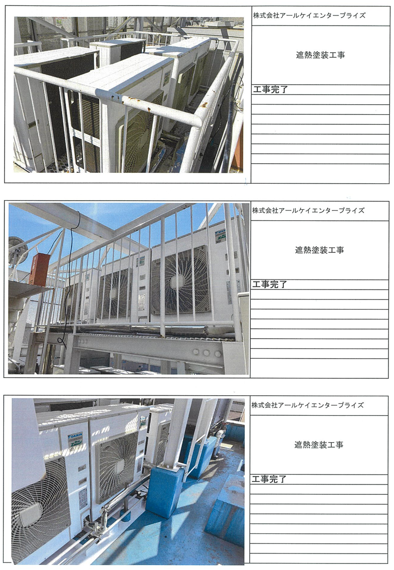 本年7月、社屋の屋上に設置されている空調室外機本体カバー(12機)と同機設置下床面(3.44㎡)に遮熱塗装加工をいたしました。この特殊塗料による遮熱効果で太陽熱を約90%反射し、室外機内外の気温上昇を抑え、空調機能の効率がアップすることで、およそ8%~16%の電気使用量が削減できると施工会社が試算しています。また、資源エネルギー庁の推計によるとオフィス電気使用量の48%を空調機が占めるとされ、節約効果にも期待が持てます。これらはカーボンニュートラル推進にもつながり、環境を守り持続可能な経済成長を進める取組みとなります。