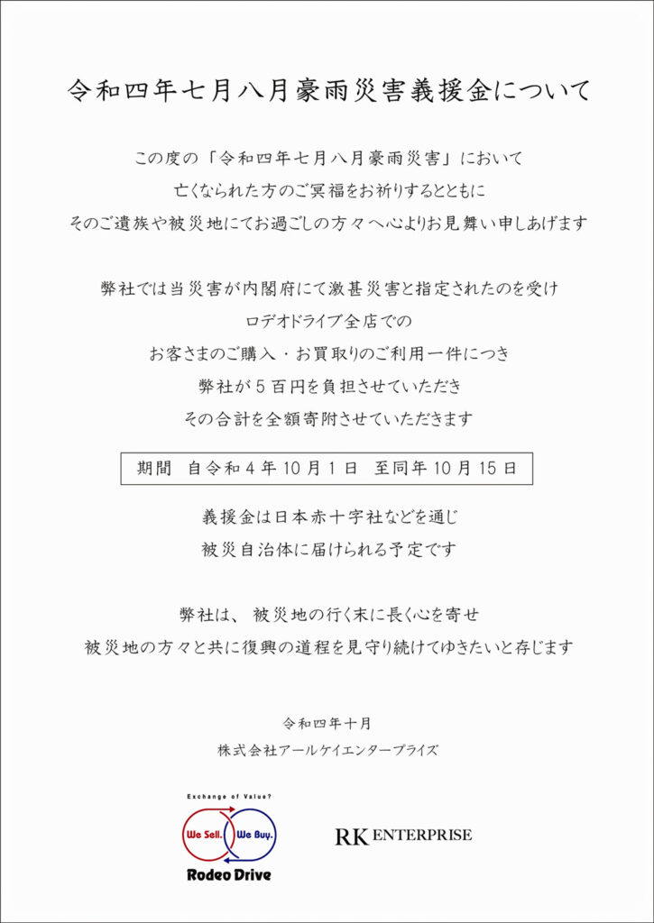 今回の義援金・寄付活動の取り組みは、2022年10月1日(土)より10月15日(土)までの期間、ロデオドライブ全店でのお客さまによる販売・買取の合計582件に500円を乗じた29万1000円を全額寄付いたします。