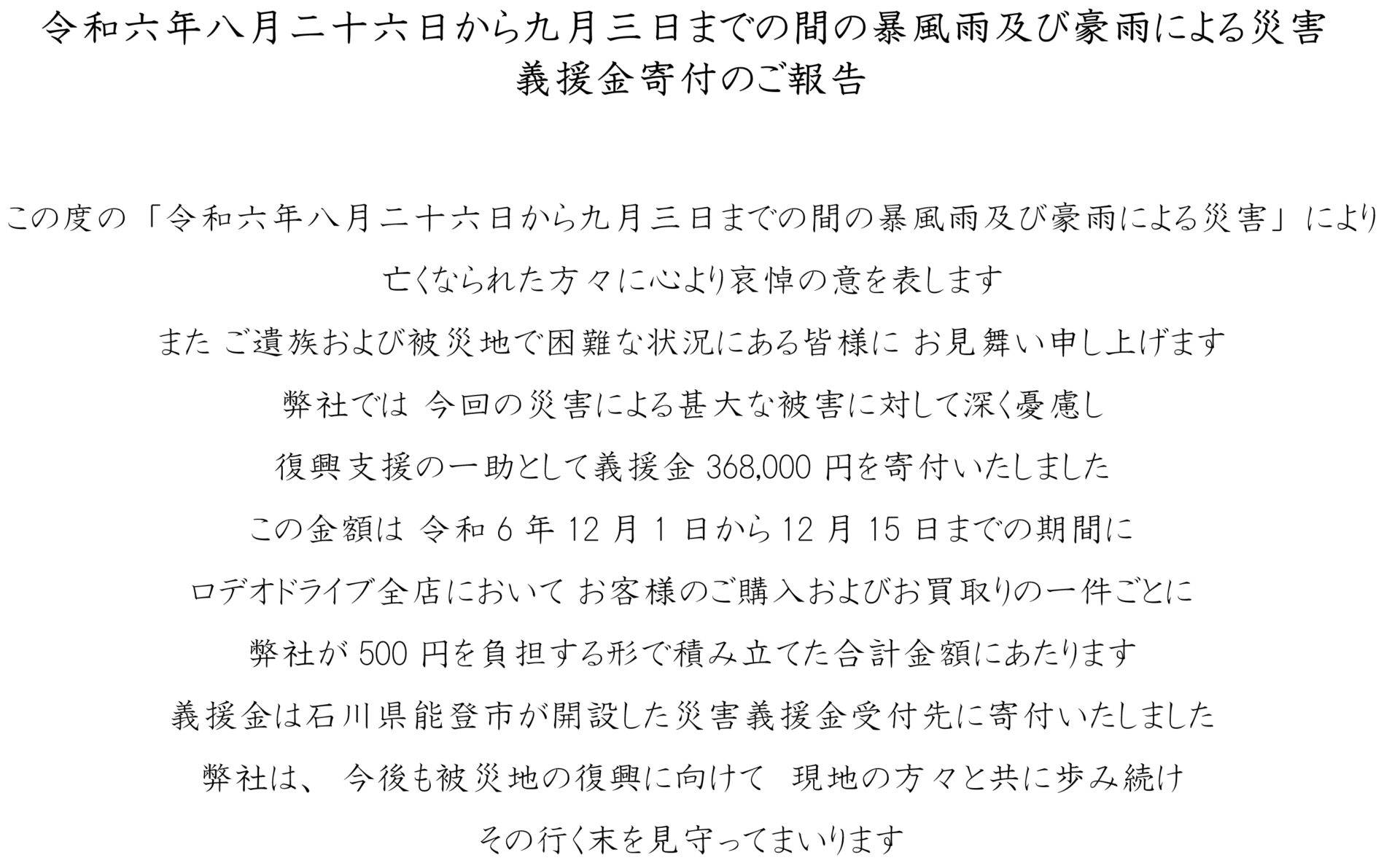 今回の義援金・寄付活動の取り組みは、2022年10月1日(土)より10月15日(土)までの期間、ロデオドライブ全店でのお客さまによる販売・買取の合計582件に500円を乗じた29万1000円を全額寄付いたします。